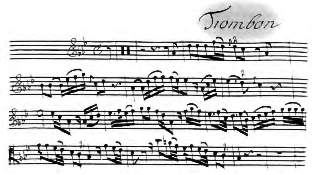 Especially for the trombonists of the time: note the number of times the composer, rather than having a melodic sequence ascend as one would expect, “drops the octave” in order to avoid what was then considered fatiguing and a risky upper tessitura.